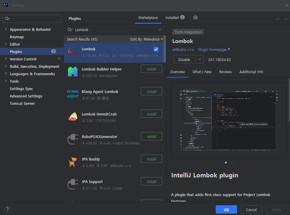 File - Settings - Plugins 에서 Lombok 검색